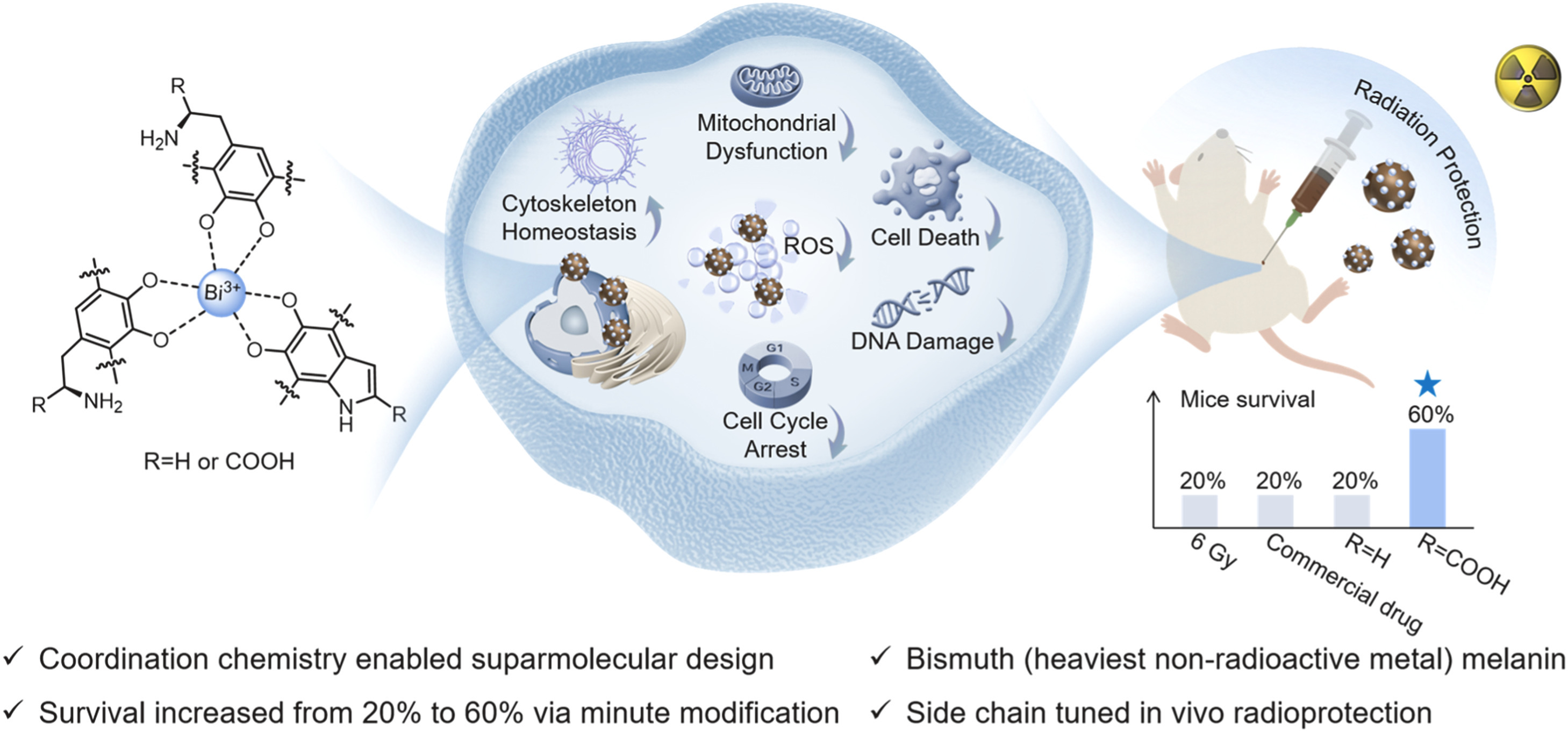 Schematic of coordination enabled in vivo radioprotective bismuth melanin material for alleviating acute radiation syndrome.