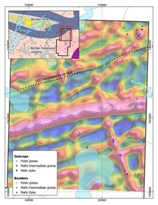In early October the company contracted Fladgate Exploration Consulting Corp. to complete a drone magnetic and LiDAR survey over the northern claims of the BLE property. The aim of the survey was to better define the contact between felsic gneisses to the south, and mafic gneiss and amphibolite units to the north which are interpreted to be part of the Borden Mine sequence stratigraphy. The survey was flown on 25 metre spaced lines at an elevation of 50 meters, providing superior resolution of magnetic and topographic features.