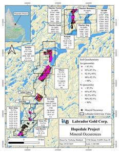 TORONTO, Nov. 06, 2025 (GLOBE NEWSWIRE) -- Labrador Gold Corp. (TSX.V: LAB | OTCQB: NKOSF | FNR: 2N6) (“LabGold” or the “Company”) is pleased to provide an update on its 2025 exploration programs at the Hopedale, Labrador and Borden Lake, Ontario gold projects. The Hopedale property covers much of the Archean-age Florence Lake greenstone belt that stretches over 60 km and is prospective for orogenic gold, volcanogenic massive sulphide (VMS) and magmatic copper-nickel deposits. The Borden Lake Extension property occurs in the Kapuskasing Structural Zone and is contiguous with Discovery’s Borden Gold Mine property.